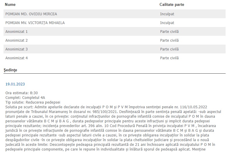 Cei doi suspecți au ajuns în arest preventiv. Au solicitat fie arest la domiciliu, fie control judiciar, dar solicitarea lor a fost respinsă. Acum, în ianuarie 2023, ei și-au aflat sentința. Aceasta este definitivă, conform portalului de justiție. Bărbatul a primit 19 ani şi 8 luni de închisoare, iar femeia 7 ani și 4 luni de închisoare, ca pedepse rezultante principale.