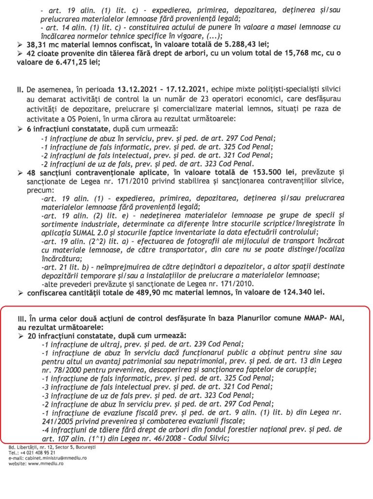 S-a vorbit și despre controalele efectuate la Ocolul Silvic Poieni, ca urmare a investigației Recorder, în care inginerul silvic Florin Tăut a scos la iveală situații incredibile în acest colț de Maramureș. În cadrul conferinței de presă, au fost prezentate și rezultatele controlului realizat pe raza Ocolului Silvic Poieni, din județul Maramureș, în urma căruia au fost constatate 20 infracțiuni, au fost aplicate 50 sancțiuni contravenționale, în valoare totală de 174.500 lei, prevăzute și sancționate de Legea nr. 171/2010 privind stabilirea și sancționarea contravențiilor, confiscarea unui volum total de 528,21 mc material lemnos, în valoare de 129.628,43 lei, precum și alte nereguli. Acțiunile de control realizate cu sprijinul reprezentanților Ministerului Afacerilor Interne au vizat activitatea de administrare a pădurilor, precum și verificarea activităților agenților economici implicați, arată reprezentanții Ministerului Mediului.