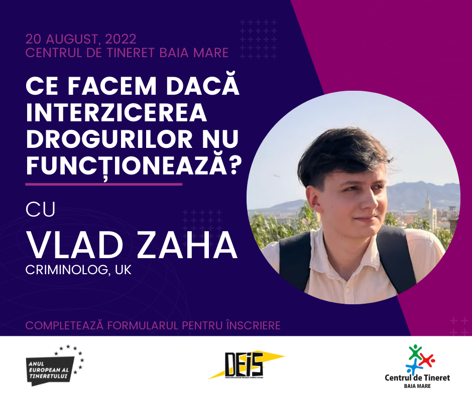 Ce facem, deci, ca indivizi și ca țară dacă interzicerea drogurilor nu funcționează? Cum ne protejăm și cum trebuie să ne gândim la fenomenul consumului și traficului de droguri? Așadar, ești invitat de către organizatori, sâmbătă, 20 august, la una dintre cele 2 sesiuni la Centrul de Tineret Baia Mare să discuți cu Vlad Zaha, criminolog stabilit în Marea Britanie.