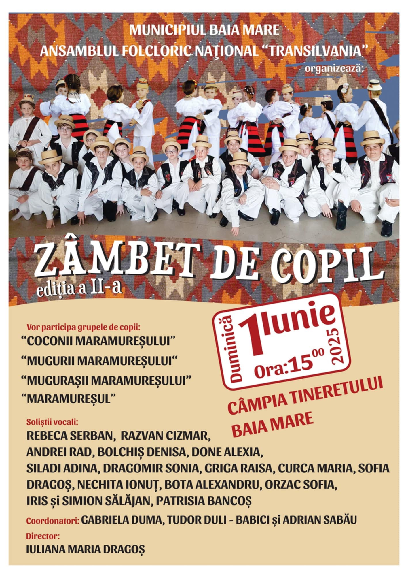 „Vă așteptăm cu drag să aplaudăm împreună zâmbetele sincere ale copiilor și să ne bucurăm de frumusețea folclorului românesc, transmis din generație în generație!”, transmite Iuliana Maria Dragoș, managerul Ansamblului Folcloric Național „Transilvania”.