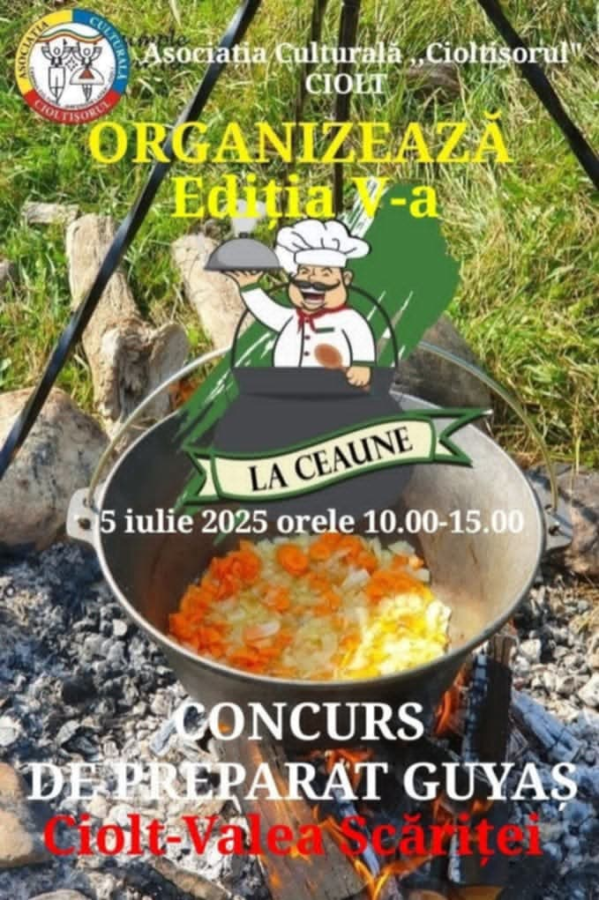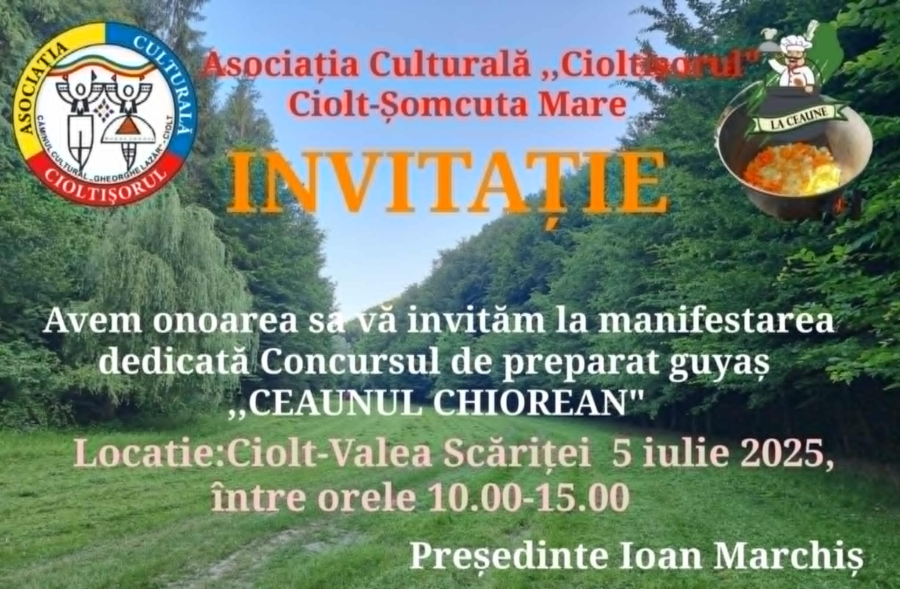 Asociația Culturală „Cioltișorul” din Ciolt, în colaborare cu comunitatea locală din Șomcuta Mare, organizează cea de-a V-a ediție a îndrăgitului Concurs de preparat gulyás „Ceanul Chiorean”. Evenimentul se va desfășura în data de 5 iulie 2025, între orele 10:00 – 15:00, în pitoreasca zonă Valea Scăriței, Ciolt, un loc cunoscut pentru peisajele sale naturale și ospitalitatea localnicilor.