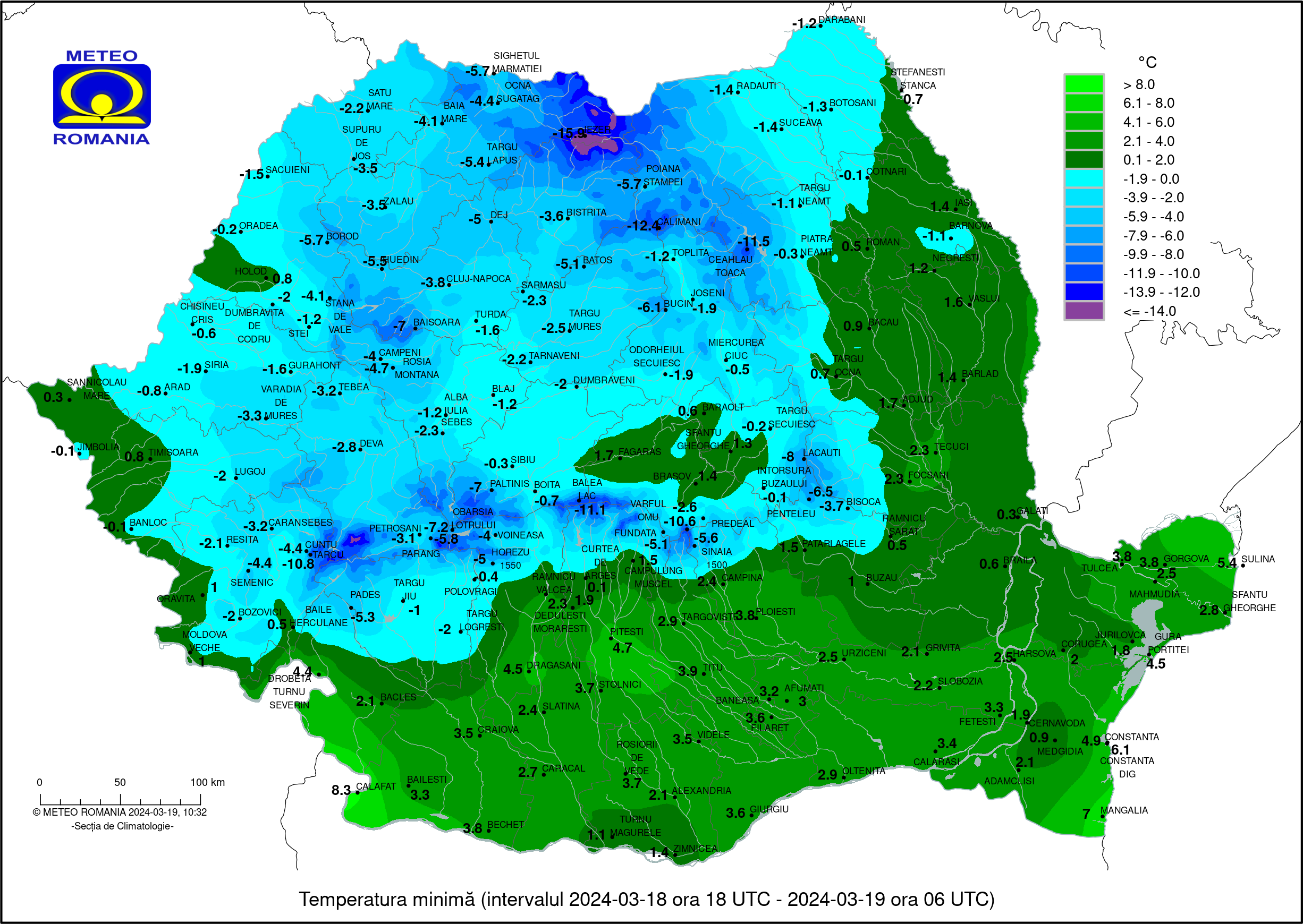 Dar așa cum am spus, avem și fluctuații termice. După zile mai calde decât ar fi normal, în această perioadă se înregistrează o apropiere de normalul termic al perioadei, care presupune, pe timpul nopții, și valori negative. Noaptea de 18 către 19 martie a fost cea mai rece din această primăvară în Maramureș. Mercurul a coborât până la -15,9 grade Celsius la stația meteo Iezer. Aceasta a fost, de altfel, cea mai coborâtă valoare din toată România, în Munții Rodnei fiind mai rece decât în Ceahlău sau la Vârful Omu ori Munții Apuseni.