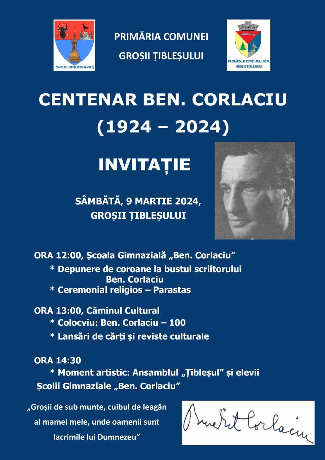 Sâmbătă, 9 martie, în Groșii Țibleșului vor avea loc mai multe manifestări dedicate scriitorului Ben Corlaciu.