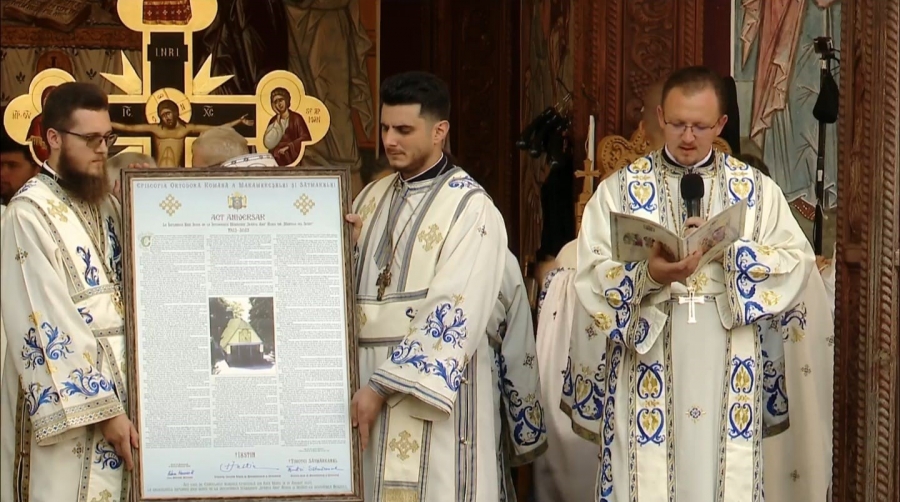 Arhidiaconul Vlad Verdeș citind documentul aniversar – credit foto: Episcopia Ortodoxă Română a Maramureșului și Sătmarului