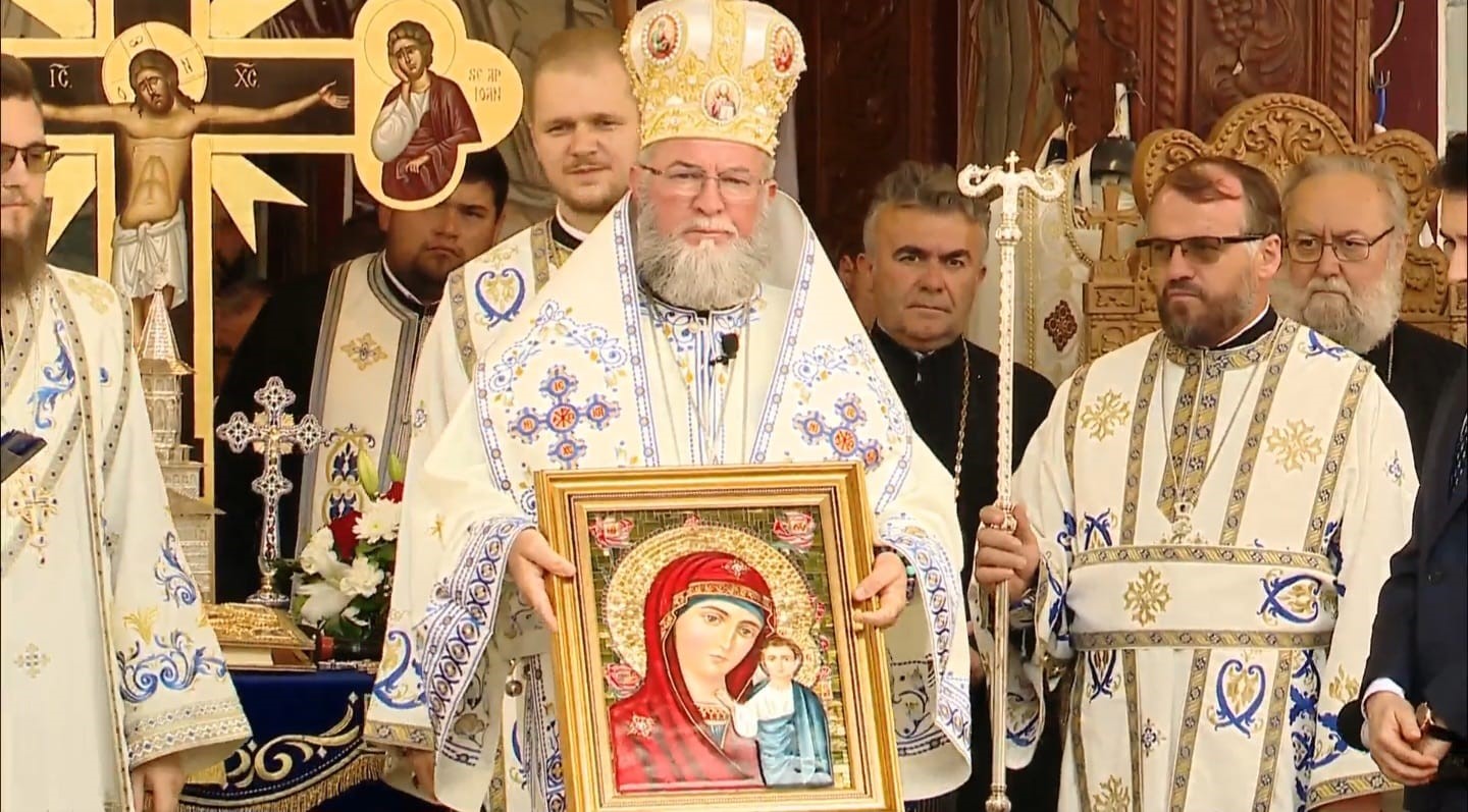 Preasfințitul Părinte Iustin care ține în mână icoana Maicii Domnului în mozaic – credit foto: Episcopia Ortodoxă Română a Maramureșului și Sătmarului