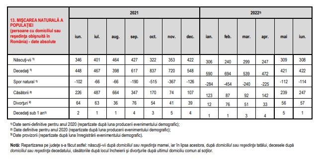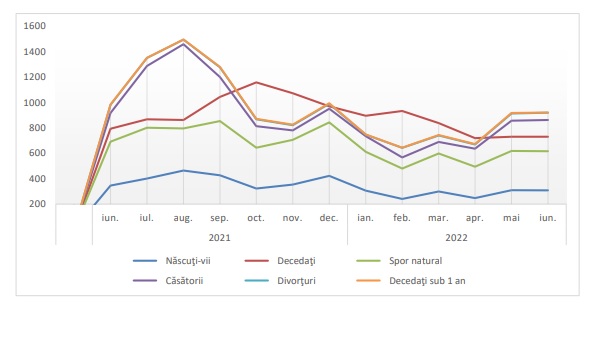 Evoluţia principalelor fenomene demografice în semestrul I 2022 comparativ cu perioada corespunzătoare din anul 2021 a fost caracterizată de scăderea natalităţii, a mortalității , a nuptialitatii si a divorțialității. Mortalitatea infantila a scăzut .Numărul născuţilor vii a fost de 1709, cu 128 mai mic faţă de semestrul I 2021, rata natalităţii a scăzut de la 7,3 la 6,7 născuţi-vii la 1000 locuitori. Numărul decedaţilor în semestrul I 2022 a fost de 3138, în scădere cu 526 cazuri faţă de semestrul I 2021, rata mortalităţii generale scăzând de la 14,2 la 12,3 decedaţi la 1000 locuitori. Sporul natural negativ al populaţiei a fost de -1429 persoane faţă de -1827 persoane în perioada corespunzătoare din anul 2021. Numărul căsătoriilor a fost în semestrul I 2022 de 930, cu 31 mai mic decât în semestrul I 2021, rata nupțialității scăzând de la 3,7 la 3,6 căsătorii la mia de locuitori. Numărul divorțurilor a fost în semestrul I 2022 de 285, în scădere cu 10 față de semestrul I 2021, rata divorțiailității scăzând de la 1,5 la 1,1 divorțuri la mia de locuitori. Numărul decedaților sub 1 an a fost de 15, cu 1 mai mare față de semestruil I 2021, rata mortalității infantile crescând de la 7,6 la 8,8 decese la mia de locuitori.