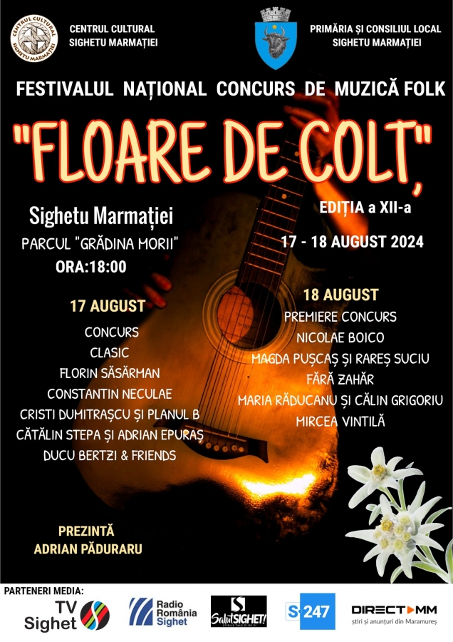 În perioada 17 – 18 august, de la ora 18.00, Parcul Grădina Morii din Sighetu Marmației va găzdui cea de-a XII-a ediție a Festivalului-concurs de folk „Floare de colț”.