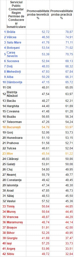 Însă în țara noastră există o mare discrepanță între județe în ceea ce privește rata de promovabilitate, iar aici nu ne referim atât la proba teoretică, cât ne referim la proba practică. Dacă în primul caz diferențele sunt mici între județele țării, în cel de-al doilea caz, acestea sunt extrem de mari. La proba teoretică intervalul variază de la 41,48% promovabilitate în Covasna la 57,52% în Vaslui, în timp ce extremele la proba practică sunt Sibiu, unde promovabilitatea este de 32,84% și Brăila, unde aceasta este de 78,87%.
