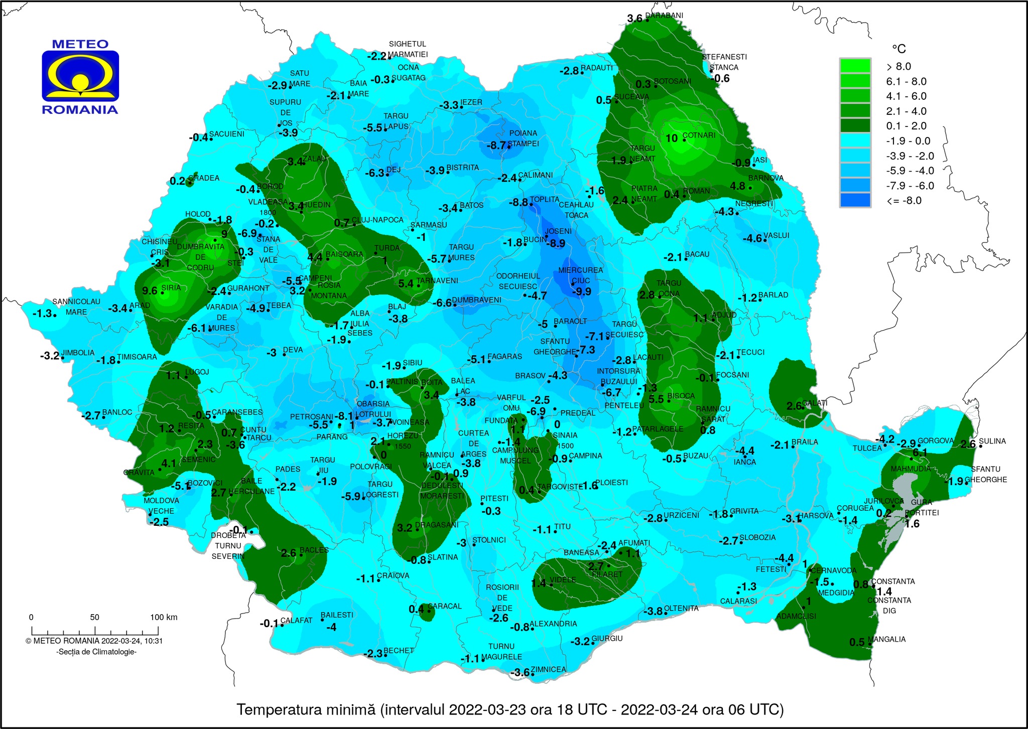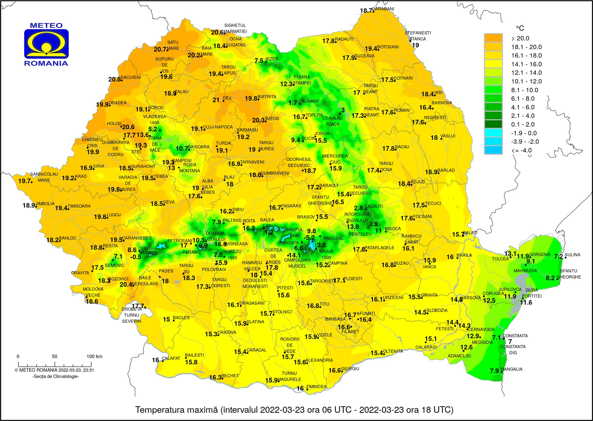 Dar diferențele mai mari sunt în 22 martie, respectiv noaptea de 22 către 23 martie. „Climatul Altiplano-ului bolivian s-a mutat la noi, amplitudini impresionante în Transilvania în aceste zile: alaltăieri diferența a fost de 24.4 grade la Baia Mare (-3.5, +20.9). Cupa a fost luată de Dej, unde recent s-a ajuns la oscilația de 27.3 grade (+21, -6.3). Mențiune: asta doar din „detentă”, în interiorul aceleiaşi mase de aer, fãră schimbări cauzate de fronturi atmosferice”, arată acum meteorologul băimărean Zsombor Orban care a analizat statistica publicată de Administrația Națională de Meteorologie.