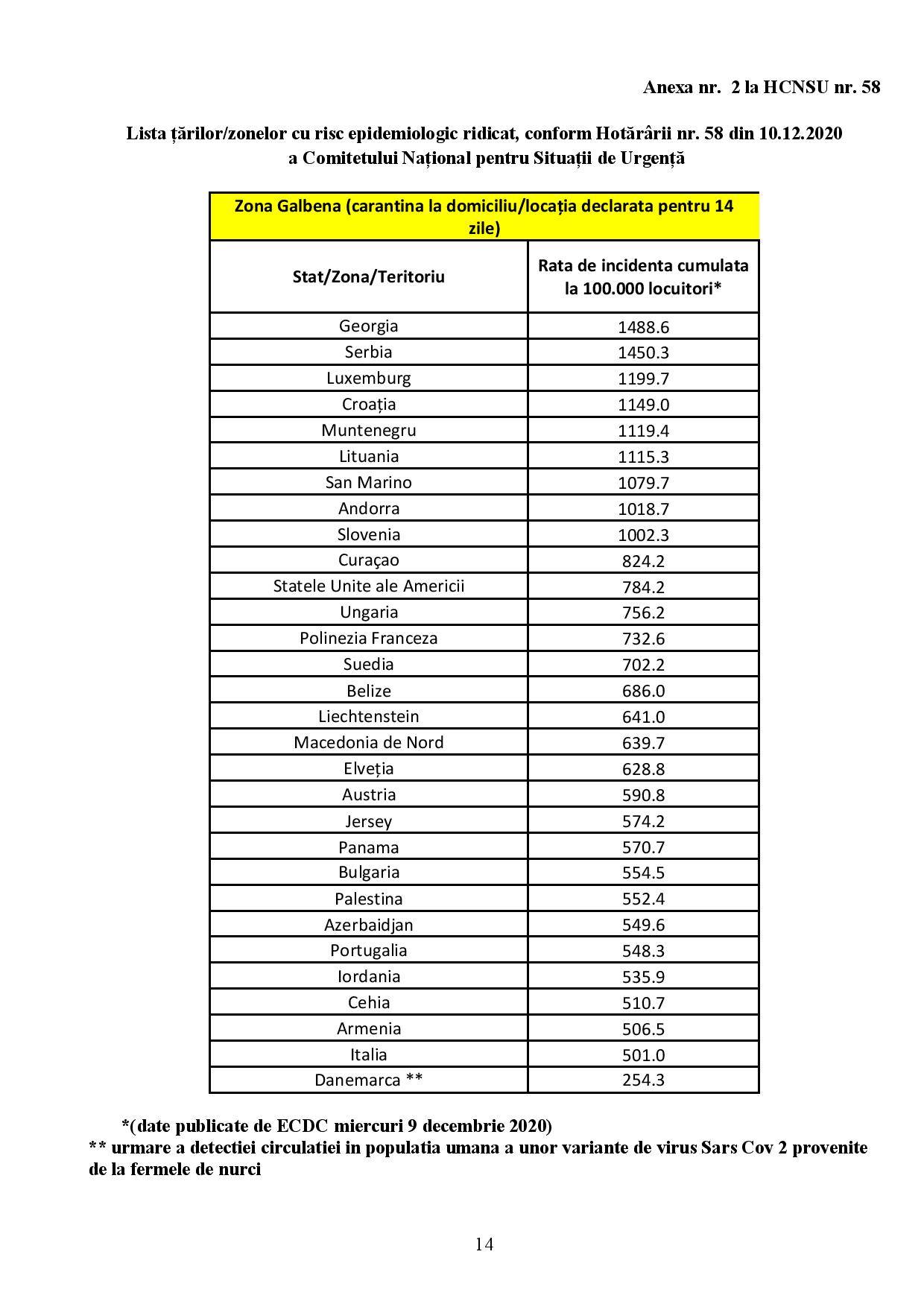 Comitetul Național pentru Situații de Urgență (CNSU) a actualizat, prin intermediul hotărârii nr. 58, lista țărilor/ zonelor/ teritoriilor de risc epidemiologic ridicat pentru care se instituie măsura carantinei pentru 14 zile asupra persoanelor care sosesc în România din acestea.