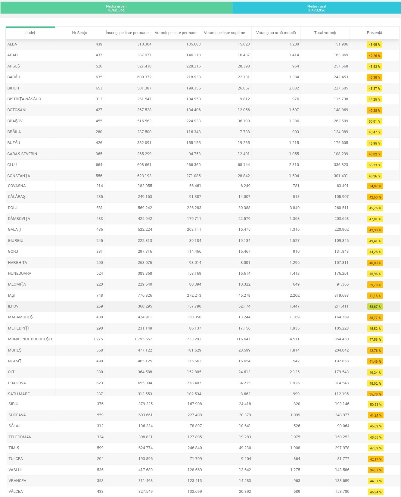 Prezența la ora 19.00 a fost de 45, 08%, mai scăzută cu patru procente decât în 2014 (când a fost de 47, 34%) Din mediul urban au votat 4,74 milioane de români, cu 1,3 milioane mai mult decât în mediul urban, păstrându-se tendința înregistrată la europarlamentare. Iată o captură de pe prezență.bec.ro a situației de la ora 19.07, care arată cum s-a votat în țară. Fruntașe sunt zonele dezvoltate: Ilfov 955, 67%), Cluj (55,33%), Sibiu (50,93%), și Brașov (50,81%), singurele care la acea oră au depășit pragul de 50%, dar erau mai multe județe care se apropiau de acest prag și-l vor depăși sigur până la încheierea votării.