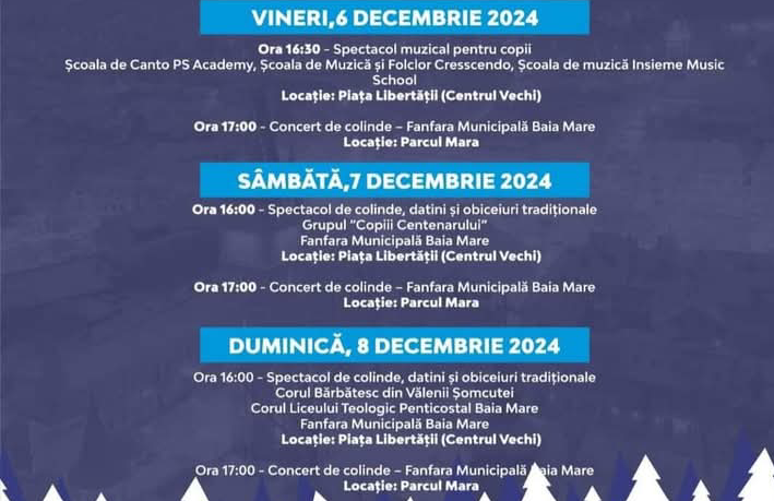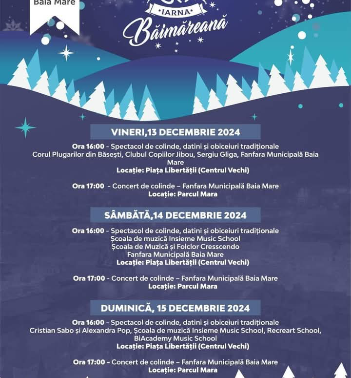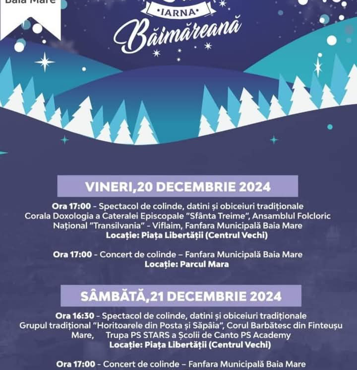 În zilele de 6,7,8,13,14,15, 20 și 21 decembrie, în Centrul Vechi și Parcul Mara vor avea loc spectacole pentru copii, concerte de colinde, coruri și Fanfara Municipală a Băii Mari. Toate acestea fac parte din programul Iernii Băimărene.