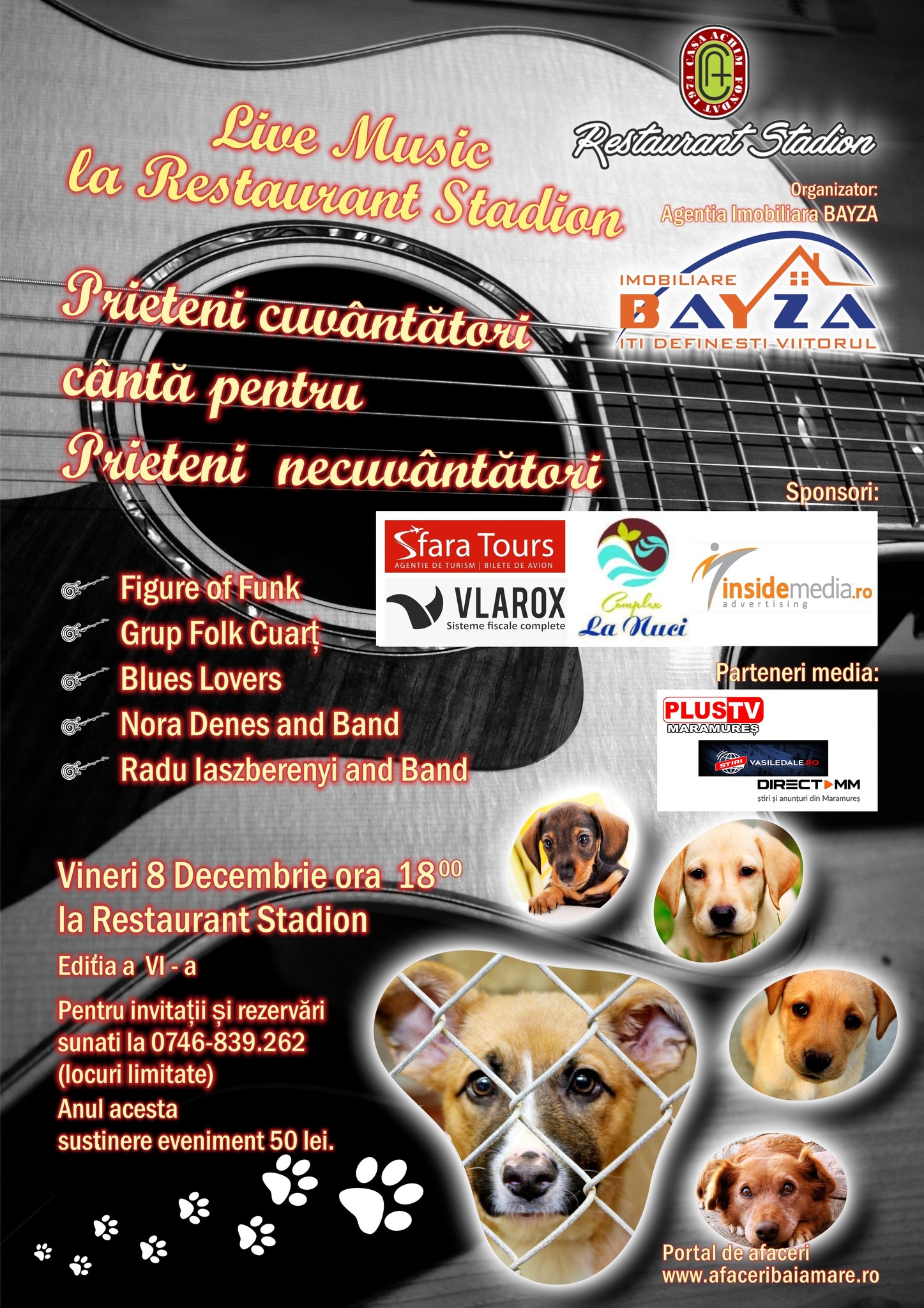 Locația va fi aceeași ca în anii anteriori, adică la Restaurantul Stadion. În cadrul acestui eveniment vă puteți delecta cu ritmuri de folk, pop, rock, blues, funcky disco, alături de: Figure of Funk, Grup Folk Cuarț, Blues Lovers, Nora Denes and Band, Radu Iaszberenyi Band. DirectMM.ro este partener media al evenimentului menit să sprijine prietenii necuvântători!