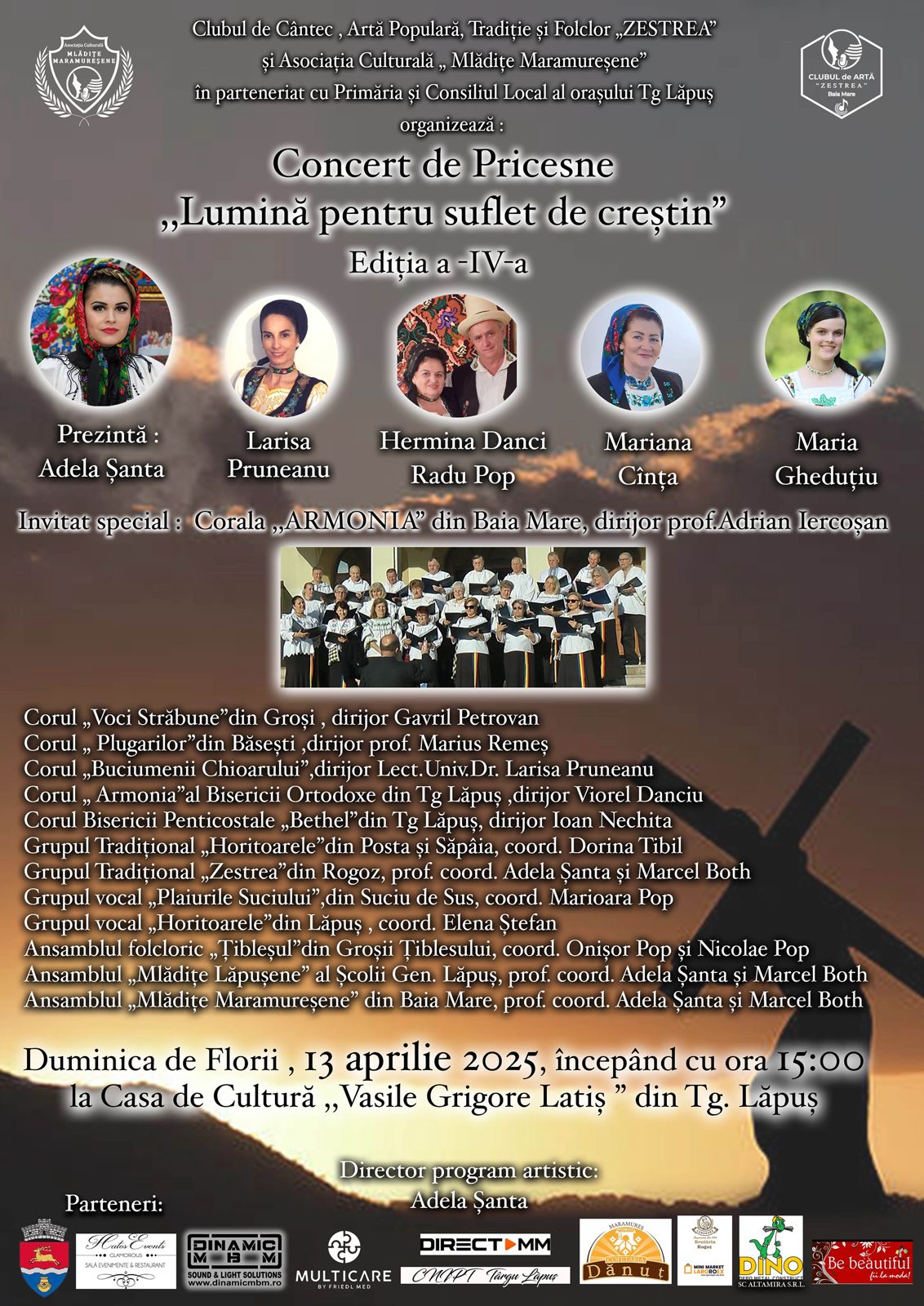 „Pentru al patrulea an consecutiv, Clubul de Artă ZESTREA din Baia Mare și Asociația Culturală Mlădițe Maramureșene, coord. prof. Adela Șanta și prof. Marcel Both, în colaborare de această dată cu Primăria și Consiliul Local al orașului Tg. Lăpuș, vor organiza pe data de 13 aprilie 2025, în Sfânta Duminică de Florii, Concertul de Pricesne ,,Lumină pentru suflet de creștin”, la Casa de Cultură „Vasile Grigore Latiș” din Tg Lăpuș, începând cu ora 15:00.