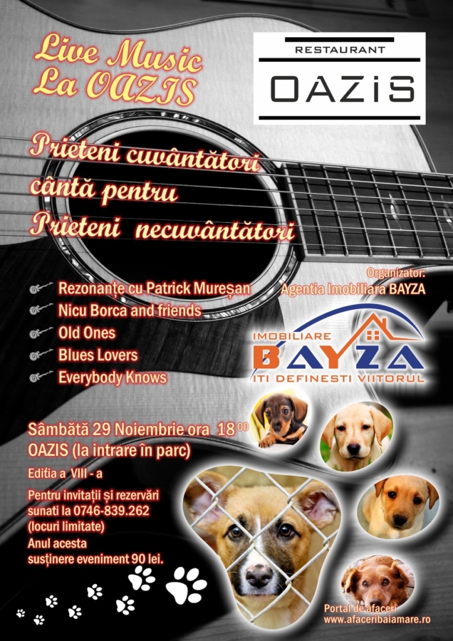 În data de 29 noiembrie 2025, se organizează cea de-a VIII- a ediție a concertului caritabil „Prieteni cuvântători cântă pentru prieteni necuvântători”, începând cu ora 18:00, la retaurantul Oazis Philia din Baia Mare. Scopul acestui eveniment este acela de a salva viața animalelor fără stăpân, printr-o strângere de fonduri și investirea lor în condițiile din adăposturile de animale din Baia Mare.