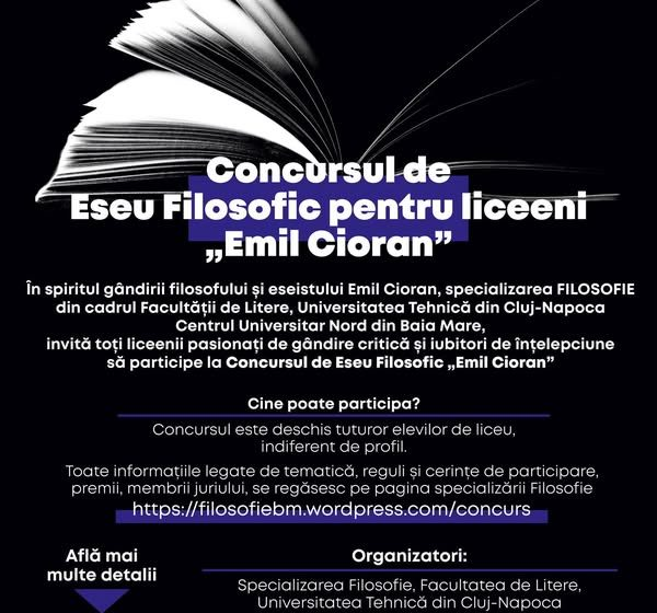 Centrul Universitar Nord Baia Mare lansează o invitație elevilor de liceu care doresc să-și testeze talentul literar și spiritul analitic în cadrul Concursului de Eseu Filosofic „Emil Cioran”. Evenimentul, dedicat celebrului filosof român, urmărește să încurajeze reflecția profundă asupra marilor teme ale existenței, ale absurdului și ale condiției umane, în spiritul operei lui Cioran.