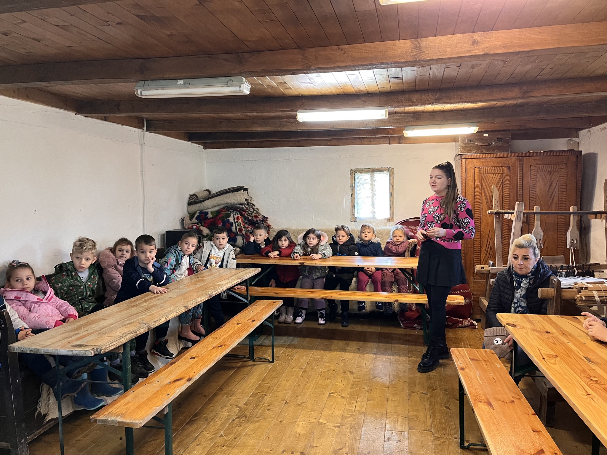 Copiii au fost întâmpinați, în prima parte a activității, de colega noastră muzeograf Gabriela Filip, care le-a prezentat acestora povestea muzeului nostru, importanța bisericii în comunitate, oferindu-le informații despre cum erau organizate de demult gospodăriile, cum trăiau oamenii pe vremea bunicilor, care erau muncile în gospodărie, precum și cum arăta un interior al unei case tradiționale. S-a vorbit și despre muncile agricole și creșterea animalelor, iar cei mici au fost foarte receptivi și dornici să împărtășească din cunoștințele și experiențele lor.