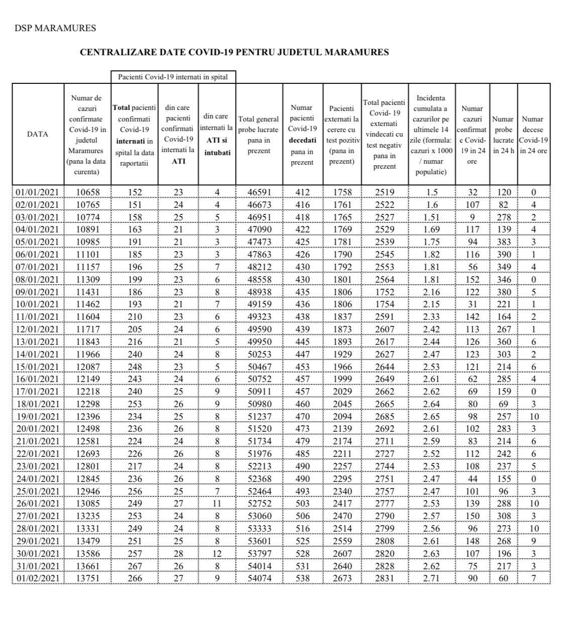 Coronavirus, 1 februarie 2021: S-a ajuns la 538 decese în Maramureș (încă 6)! În județ, în total, 13.751 cazuri de la început (90 noi)