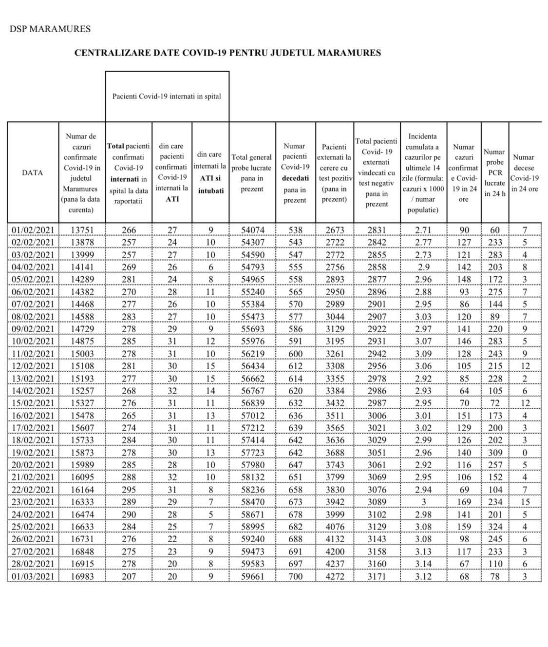 Coronavirus, 1 martie 2021: S-a ajuns la 700 decese în Maramureș (încă 3)! În județ, în total, 16.983 cazuri de la început (68 noi)