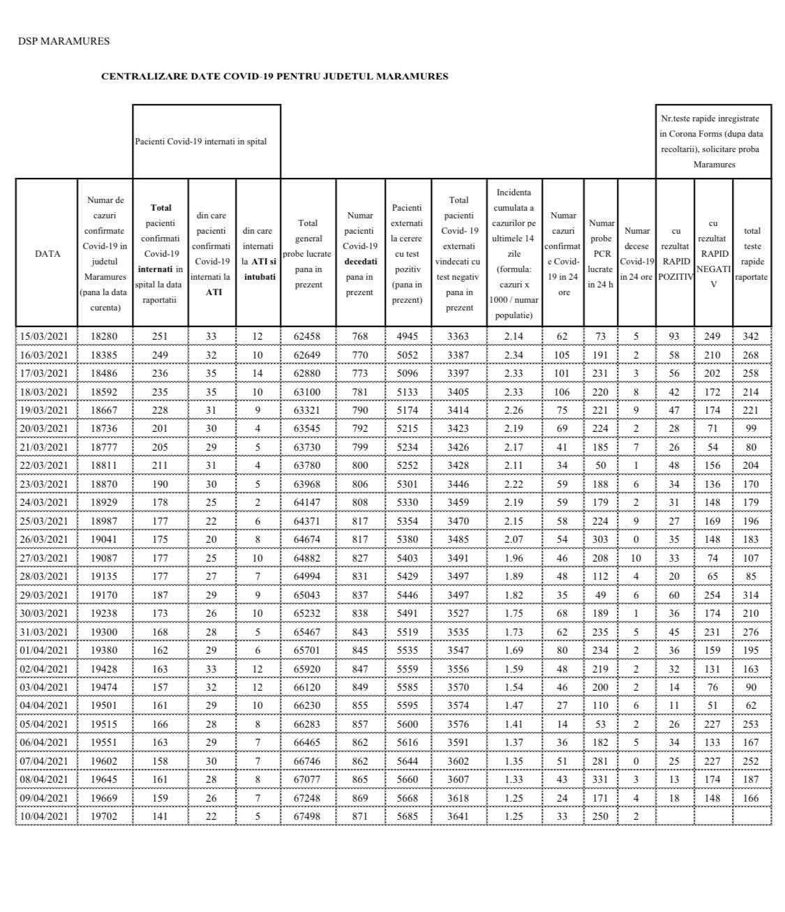 Coronavirus, 10 aprilie 2021: S-a ajuns la 871 decese în Maramureș (încă 2)! În județ, în total, 19.703 cazuri de la început (34 noi)