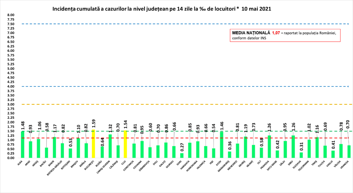 Referitor la cele 4 noi cazuri, acestea sunt din tot județul. În ceea ce privește decesul cu numărul 923, este vorba despre un bărbat din categoria de vârstă 60-69 de ani, care a prezentat comorbidități. Incidența de cazuri la mia de locuitori a ajuns la 0,36, deci județul se află în scenariul verde. Statistica actualizată a DSP Maramureș, aferentă situației epidemiologice din județ, o regăsiți la finalul materialului. Aici ar fi de făcut o precizare: în cifrele comunicate de Centrul Județean de Coordonare și Conducere a Intervenției, conform protocolului național, apar doar pacienții internați la ATI la spitalul-suport COVID-19, adică Spitalul de Pneumoftiziologie din Baia Mare. În cifrele comunicate de DSP apare totalul de pacienți internați pe secțiile ATI din județ, adică pe lângă cei internați în spitalul-suport, și cei aflați pe secțiile-tampon ATI de la Spitalul Județean Baia Mare și Spitalul Municipal Sighetu Marmației.