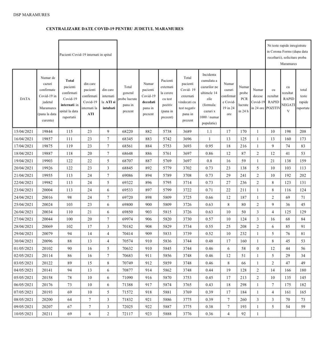 Coronavirus, 10 mai 2021: S-a ajuns la 923 decese în Maramureș (încă 1)! În județ, în total, 20.211 cazuri de la început (4 noi)