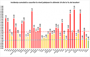 Coeficientul infectărilor cumulate la 14 zile, raportate la 1.000 de locuitori este calculat de către Direcțiile de Sănătate Publică, la nivelul Municipiului București și al județelor. Graficul realizat în baza raportărilor primite de CNCCI de la Direcțiile de Sănătate Publică îl regăsiți la finalul materialului.
