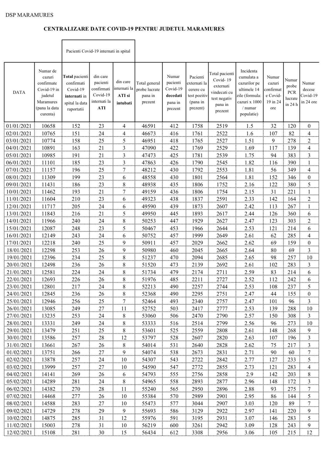 Referitor la cele 106 noi cazuri, acestea sunt din tot județul. Din păcate, vorbim astăzi despre recordul de decese în județ, de la începutul pandemiei. În ceea ce privește decesele cu numerele 601-612, este vorba despre opt bărbați, din care unul din categoria de vârstă 50-59 de ani, doi din categoria de vârstă 60-69 de ani, doi din categoria de vârstă 70-79 de ani și trei din categoria de vârstă de 80 de ani și peste și patru femei, două din categoria de vârstă 60-69 de ani și câte una din categoriile de vârstă 70-79 de ani și de 80 de ani și peste, cu toții cu comorbidități. Incidența de cazuri la mia de locuitori a ajuns la 3,06, deci județul se află în scenariul roșu, fiind pe locul doi după județul Timiș. Statistica actualizată a DSP Maramureș, aferentă situației epidemiologice din județ, o regăsiți la finalul materialului. Aici ar fi de făcut o precizare: în cifrele comunicate de Centrul Județean de Coordonare și Conducere a Intervenției, conform protocolului național, apar doar pacienții internați la ATI la spitalul-suport COVID-19, adică Spitalul de Pneumoftiziologie din Baia Mare. În cifrele comunicate de DSP apare totalul de pacienți internați pe secțiile ATI din județ, adică pe lângă cei internați în spitalul-suport, și cei aflați pe secțiile-tampon ATI de la Spitalul Județean Baia Mare și Spitalul Municipal Sighetu Marmației.