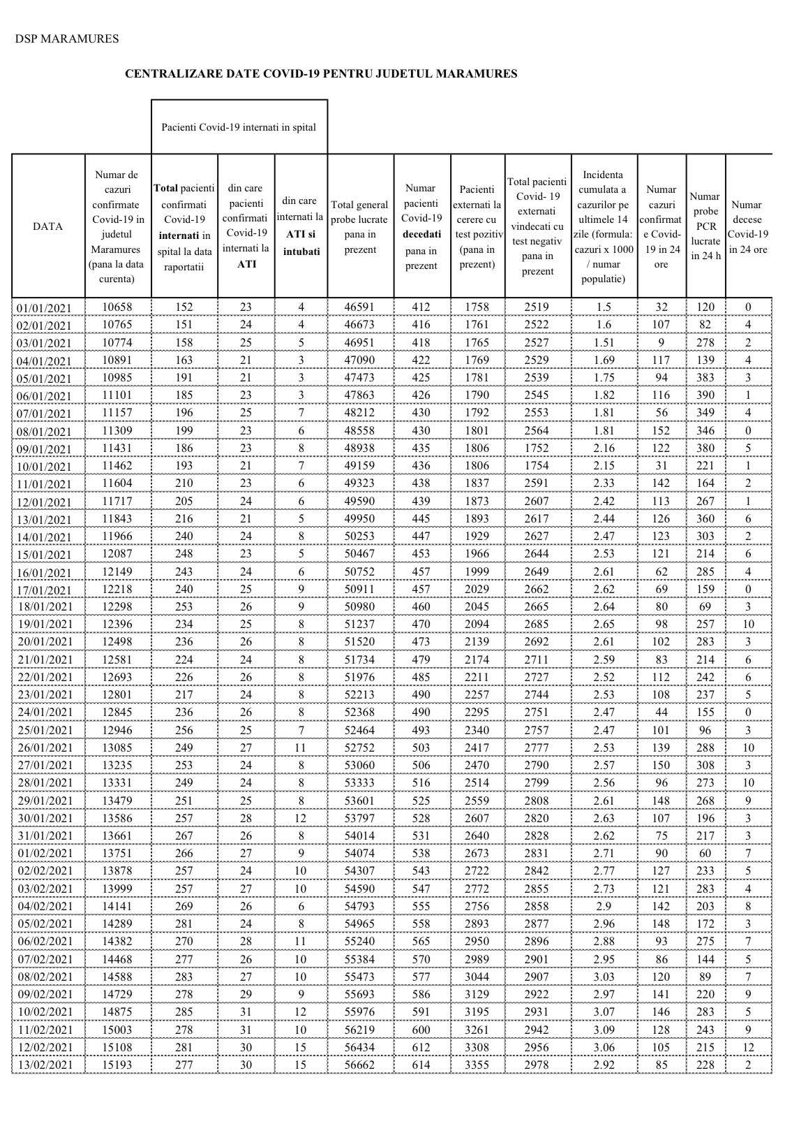 Coronavirus, 13 februarie 2021: S-a ajuns la 614 decese în Maramureș (încă 2)! În județ, în total, 15.153 cazuri de la început (45 noi)