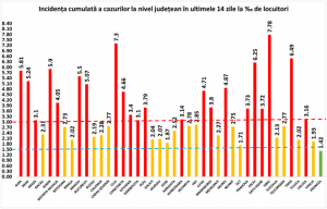 Coeficientul infectărilor cumulate la 14 zile, raportate la 1.000 de locuitori este calculat de către Direcțiile de Sănătate Publică, la nivelul Municipiului București și al județelor. Graficul realizat în baza raportărilor primite de CNCCI de la Direcțiile de Sănătate Publică îl regăsiți la finalul materialului.