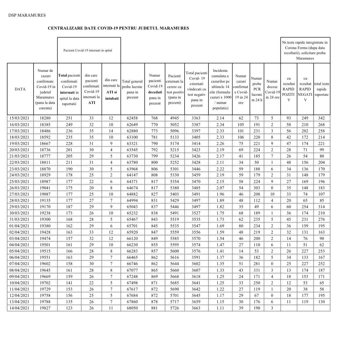 Coronavirus, 14 aprilie 2021: S-a ajuns la 881 decese în Maramureș (încă 3)! În județ, în total, 19.827 cazuri de la început (39 noi)