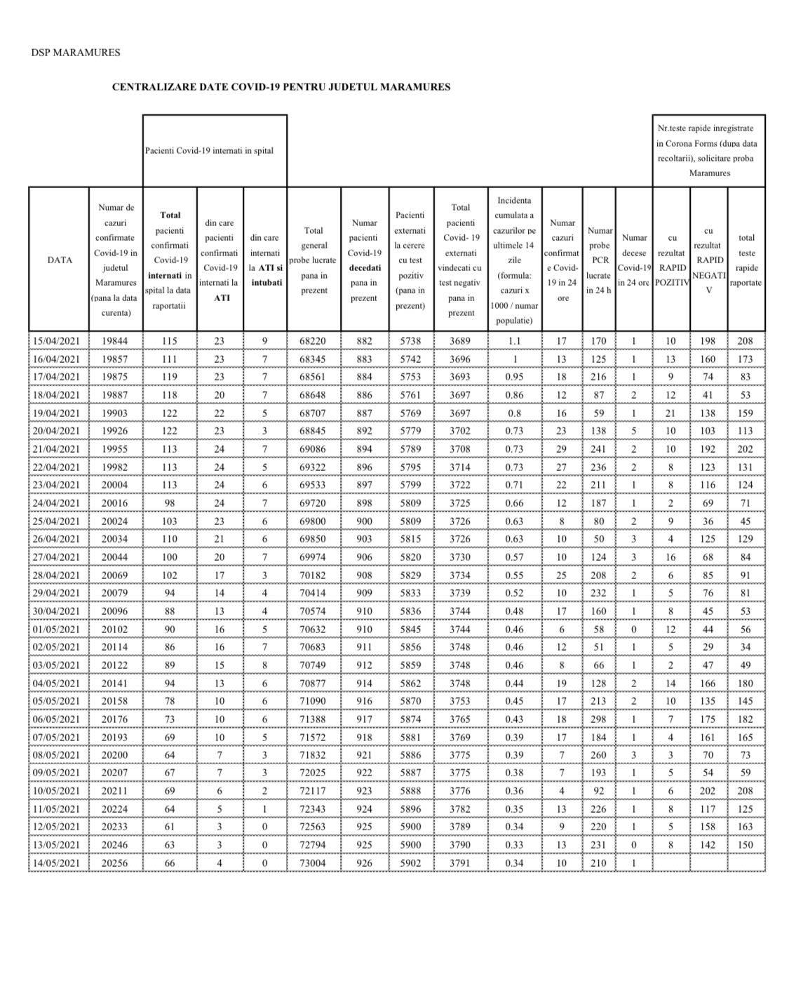 Coronavirus, 14 mai 2021: S-a ajuns la 926 decese în Maramureș (încă 1)! În județ, în total, 20.256 cazuri de la început (10 noi)