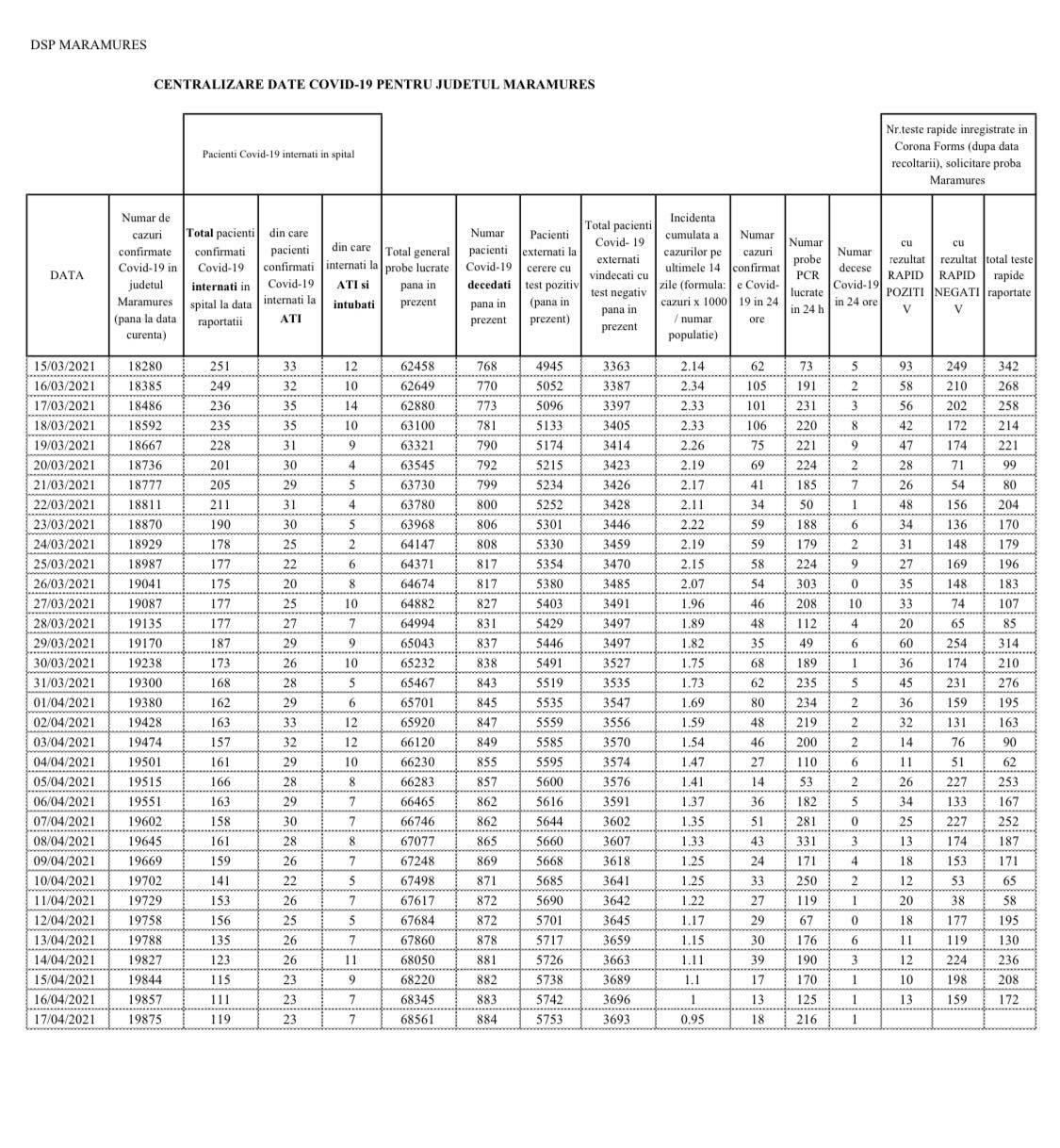 Coronavirus, 17 aprilie 2021: S-a ajuns la 884 decese în Maramureș (încă 1)! În județ, în total, 19.875 cazuri de la început (18 noi)