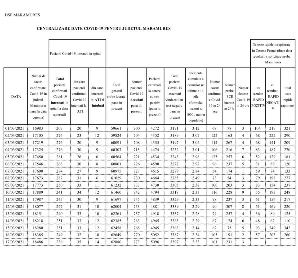 Coronavirus, 17 martie 2021: S-a ajuns la 773 decese în Maramureș (încă 3)! În județ, în total, 18.486 cazuri de la început (101 noi)