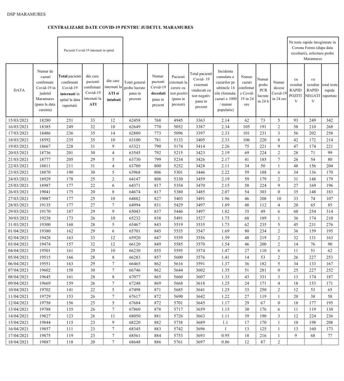 Coronavirus, 18 aprilie 2021: S-a ajuns la 886 decese în Maramureș (încă 2)! În județ, în total, 19.887 cazuri de la început (12 noi)