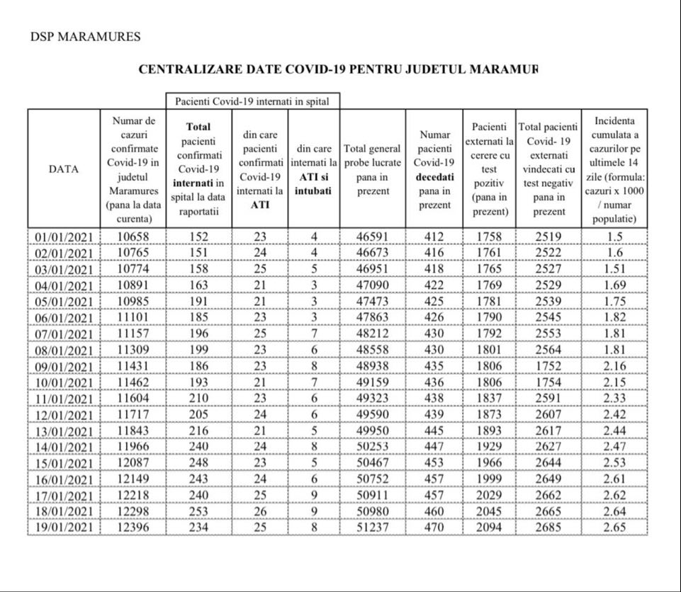 Coronavirus, 19 ianuarie 2021: S-a ajuns la 468 decese în Maramureș (încă 6)! În județ, în total, 12.396 cazuri de la început (98 noi)