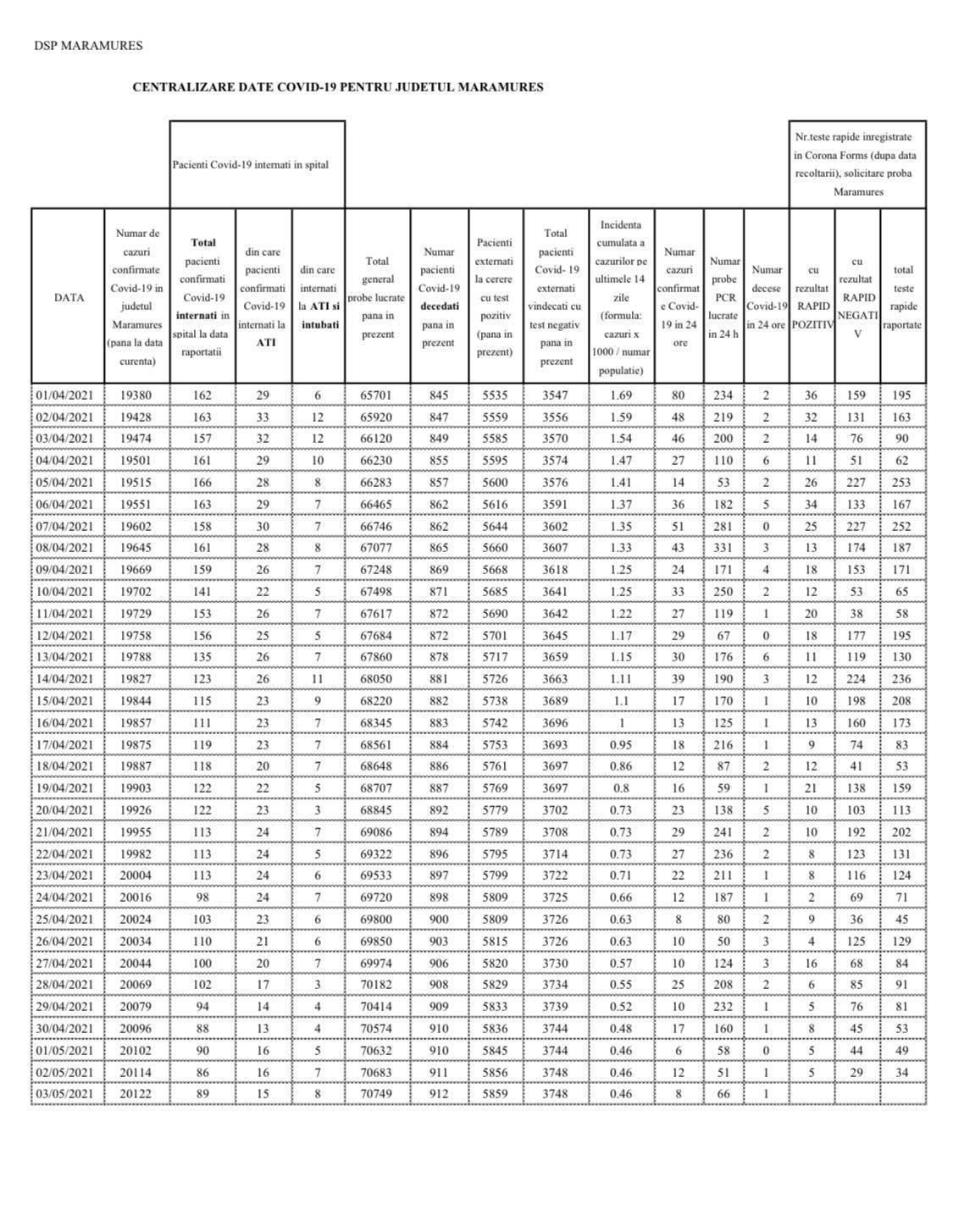Coronavirus, 2-3 mai 2021: S-a ajuns la 913 decese în Maramureș (2+1)! În județ, în total, 20.122 cazuri de la început (12+8)