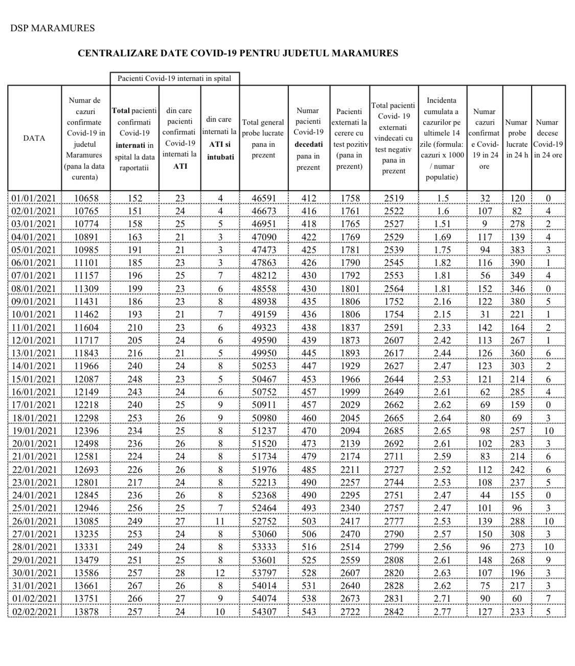 Coronavirus, 2 februarie 2021: S-a ajuns la 543 decese în Maramureș (încă 5)! În județ, în total, 13.878 cazuri de la început (127 noi)