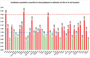 Coeficientul infectărilor cumulate la 14 zile, raportate la 1.000 de locuitori, calculat de către Direcțiile de Sănătate Publică, la nivelul Municipiului București și al județelor îl găsiți la finalul materialului.