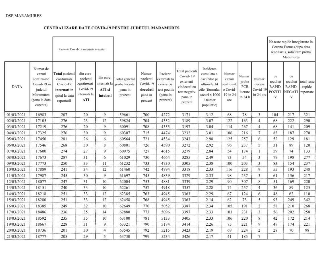 Coronavirus, 21 martie 2021: S-a ajuns la 799 decese în Maramureș (încă 9)! În județ, în total, 18.778 cazuri de la început (42 noi)