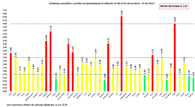 Referitor la cele 42 noi cazuri, acestea sunt din tot județul. În ceea ce privește decesele cu numerele 791-799, este vorba despre șase bărbați, din care unul din categoria de vârstă 60-69 de ani, trei din categoria de vârstă 70-79 de ani și doi din categoria de vârstă de 80 de ani și peste, și trei femei, din care două din categoria de vârstă 60-69 de ani și una din categoria de vârstă 70-79 de ani, cu toții cu comorbidități. Incidența de cazuri la mia de locuitori a ajuns la 2,17, deci județul se află în scenariul galben. Statistica actualizată a DSP Maramureș, aferentă situației epidemiologice din județ, o regăsiți la finalul materialului. Aici ar fi de făcut o precizare: în cifrele comunicate de Centrul Județean de Coordonare și Conducere a Intervenției, conform protocolului național, apar doar pacienții internați la ATI la spitalul-suport COVID-19, adică Spitalul de Pneumoftiziologie din Baia Mare. În cifrele comunicate de DSP apare totalul de pacienți internați pe secțiile ATI din județ, adică pe lângă cei internați în spitalul-suport, și cei aflați pe secțiile-tampon ATI de la Spitalul Județean Baia Mare și Spitalul Municipal Sighetu Marmației.