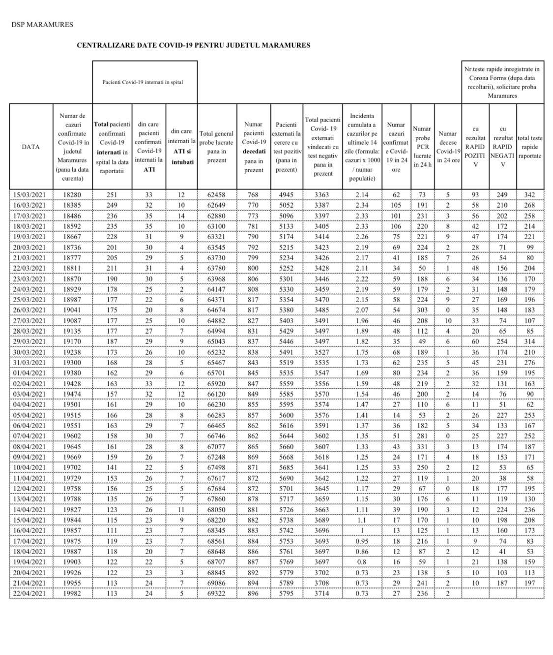 Coronavirus, 22 aprilie 2021: S-a ajuns la 896 decese în Maramureș (încă 2)! În județ, în total, 19.982 cazuri de la început (27 noi)