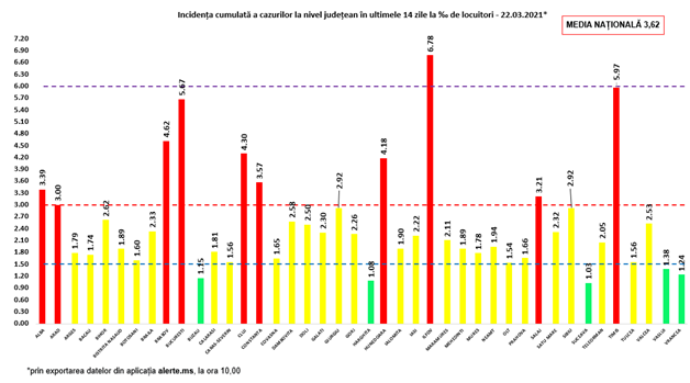 Referitor la cele 33 noi cazuri, acestea sunt din tot județul. În ceea ce privește decesul cu numărul 800, este vorba despre un bărbat din categoria de vârstă 40-49 de ani, care nu a prezentat comorbidități. Incidența de cazuri la mia de locuitori a ajuns la 2,11, deci județul se află în scenariul galben. Statistica actualizată a DSP Maramureș, aferentă situației epidemiologice din județ, o regăsiți la finalul materialului. Aici ar fi de făcut o precizare: în cifrele comunicate de Centrul Județean de Coordonare și Conducere a Intervenției, conform protocolului național, apar doar pacienții internați la ATI la spitalul-suport COVID-19, adică Spitalul de Pneumoftiziologie din Baia Mare. În cifrele comunicate de DSP apare totalul de pacienți internați pe secțiile ATI din județ, adică pe lângă cei internați în spitalul-suport, și cei aflați pe secțiile-tampon ATI de la Spitalul Județean Baia Mare și Spitalul Municipal Sighetu Marmației.
