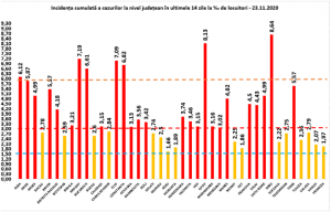 Coeficientul infectărilor cumulate la 14 zile, raportate la 1.000 de locuitori este calculat de către Direcțiile de Sănătate Publică, la nivelul Municipiului București și al județelor. Graficul realizat în baza raportărilor primite de CNCCI de la Direcțiile de Sănătate Publică îl regăsiți la finalul materialului.