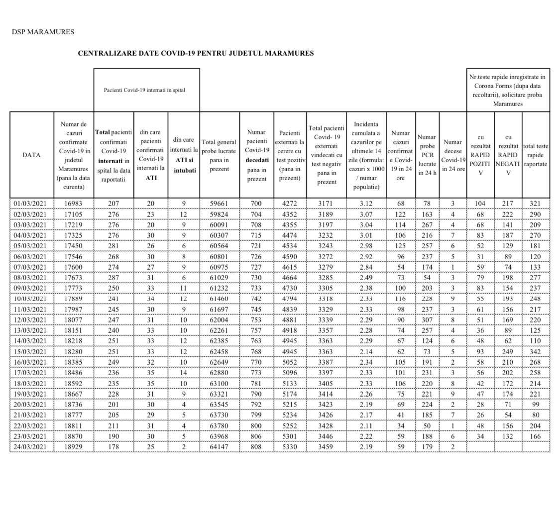 Coronavirus, 24 martie 2021: S-a ajuns la 808 decese în Maramureș (încă 2)! În județ, în total, 18.929 cazuri de la început (58 noi)