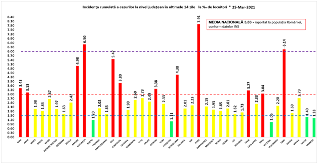 Referitor la cele 58 noi cazuri, acestea sunt din tot județul. În ceea ce privește decesele cu numerele 809-817, este vorba despre șase bărbați, din care unul din categoria de vârstă 50-59 de ani, doi din categoria de vârstă 60-69 de ani, doi din categoria de vârstă 70-79 de ani și unul din categoria de vârstă de 80 de ani și peste, și trei femei, două din categoria de vârstă 70-79 de ani și unul din categoria de vârstă de 80 de ani și peste, cu toții cu comorbidități. Incidența de cazuri la mia de locuitori a ajuns la 2,15, deci județul se află în scenariul galben. Statistica actualizată a DSP Maramureș, aferentă situației epidemiologice din județ, o regăsiți la finalul materialului. Aici ar fi de făcut o precizare: în cifrele comunicate de Centrul Județean de Coordonare și Conducere a Intervenției, conform protocolului național, apar doar pacienții internați la ATI la spitalul-suport COVID-19, adică Spitalul de Pneumoftiziologie din Baia Mare. În cifrele comunicate de DSP apare totalul de pacienți internați pe secțiile ATI din județ, adică pe lângă cei internați în spitalul-suport, și cei aflați pe secțiile-tampon ATI de la Spitalul Județean Baia Mare și Spitalul Municipal Sighetu Marmației.