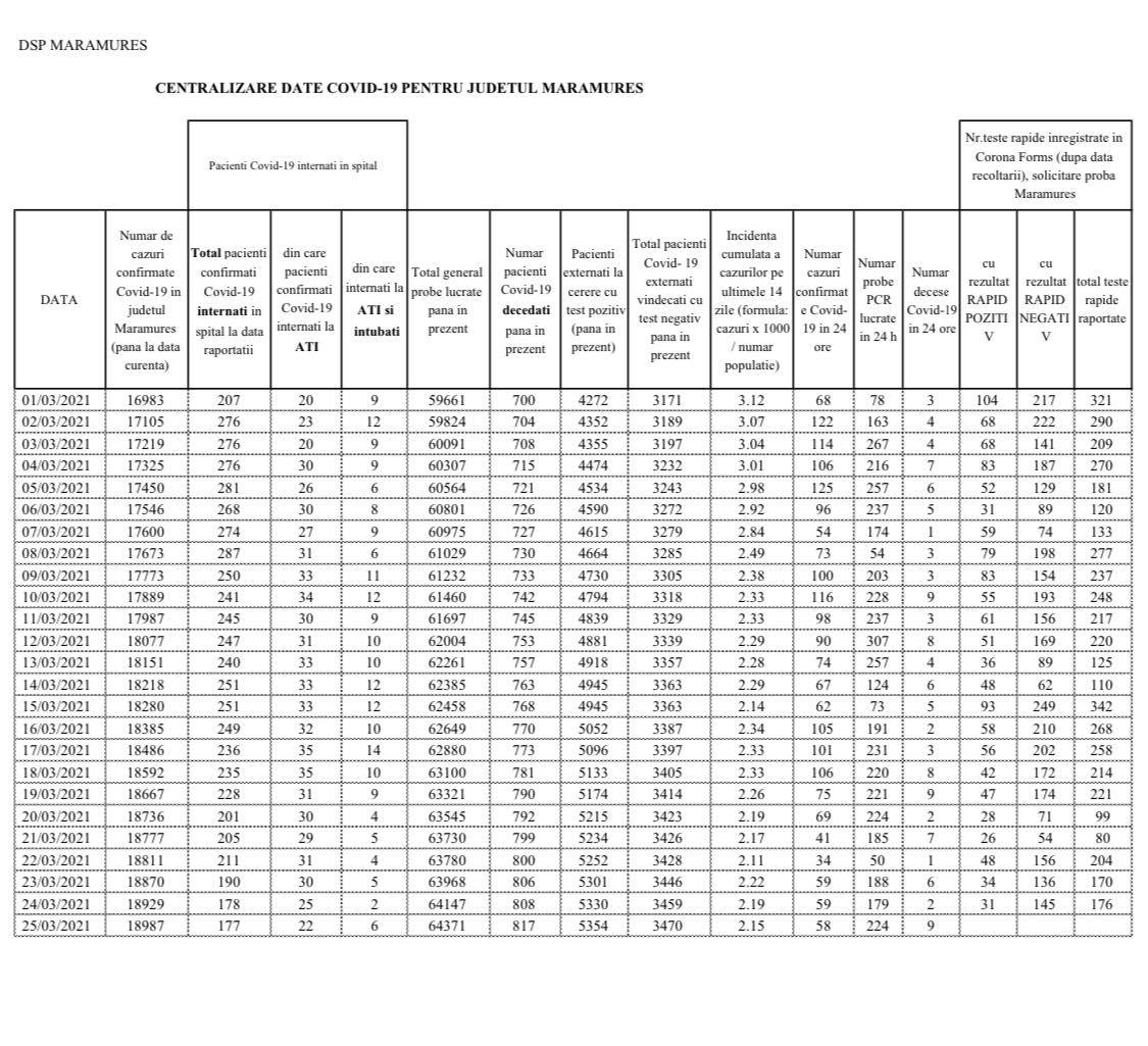 Coronavirus, 25 martie 2021: S-a ajuns la 817 decese în Maramureș (încă 9)! În județ, în total, 18.987 cazuri de la început (58 noi)