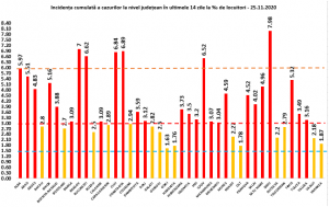Coeficientul infectărilor cumulate la 14 zile, raportate la 1.000 de locuitori este calculat de către Direcțiile de Sănătate Publică, la nivelul Municipiului București și al județelor. Graficul realizat în baza raportărilor primite de CNCCI de la Direcțiile de Sănătate Publică îl regăsiți la finalul materialului.