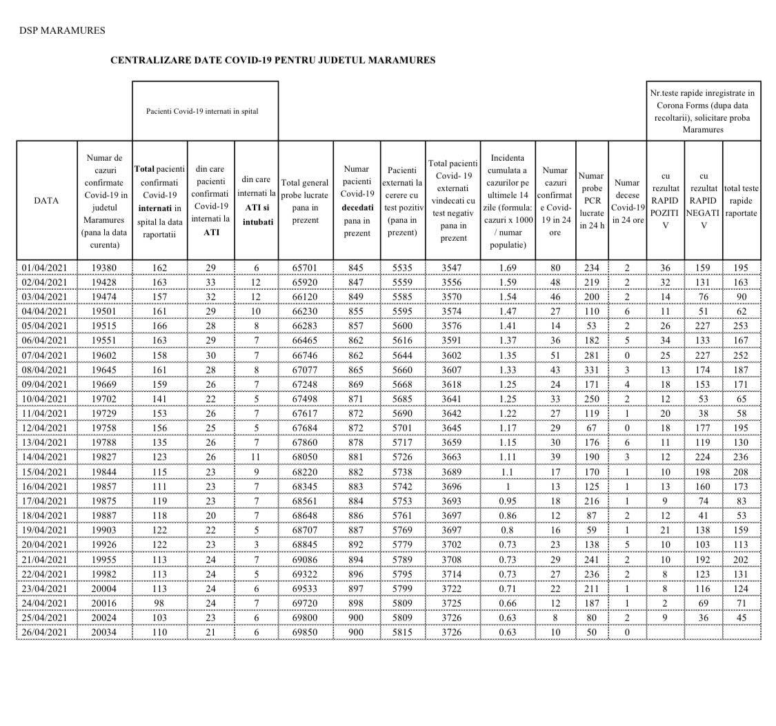 Coronavirus, 26 aprilie 2021: S-a ajuns la 901 decese în Maramureș (încă 1)! În județ, în total, 20.034 cazuri de la început (10 noi)
