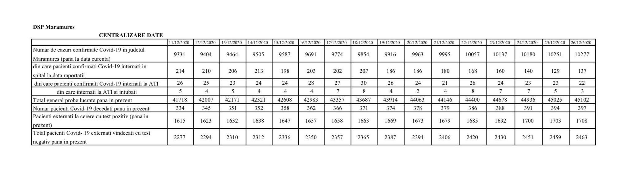Coronavirus, 26 decembrie 2020: S-a ajuns la 397 decese în Maramureș (încă 3)! În județ, în total, 10.277 cazuri de la început (51 noi)